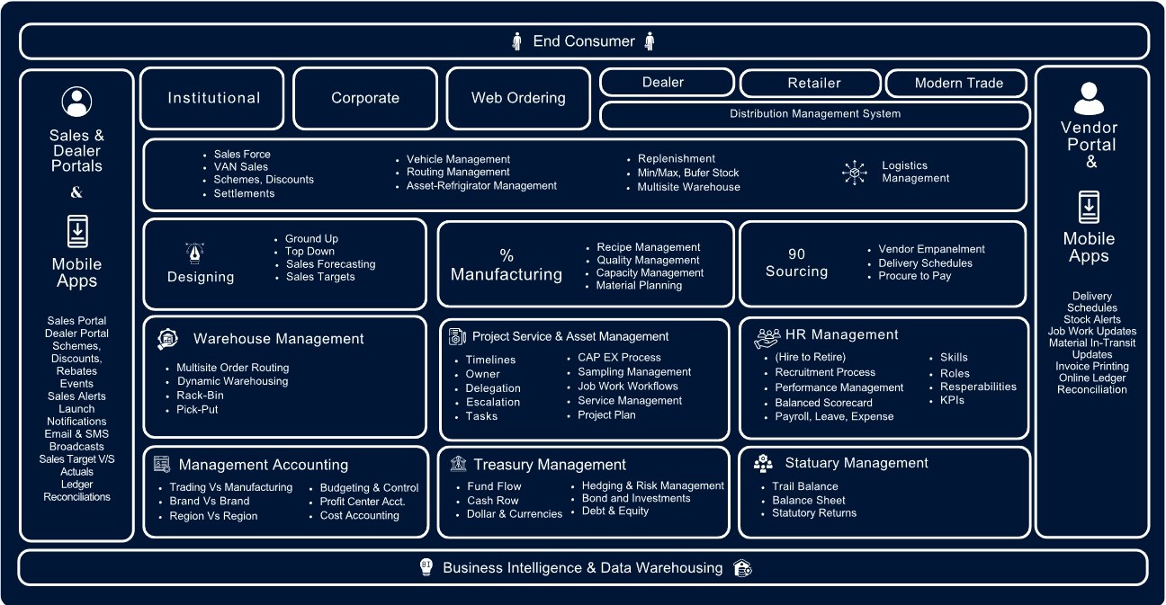 Below is a snapshot of the Retail & Skill Manufacturing industry landscape, integrated through ERP, CRM, Supply chain, Mobility tools, and external-facing systems for Vendors and Customers. This is the industry’s typical ‘To Be‘ state, making the organization efficient and agile.